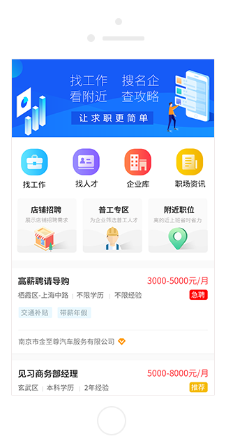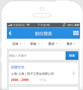 随时随地搜索工作,轻轻松松应聘职位,工作前途一手掌握。